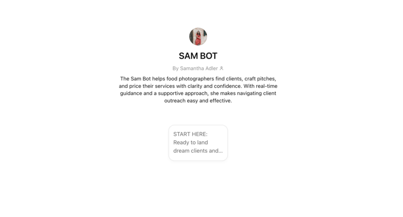 No. SAMBOT is mentorship intelligence, trained on my real strategies, coaching, and Profit in Style frameworks that help food photographers build successful businesses