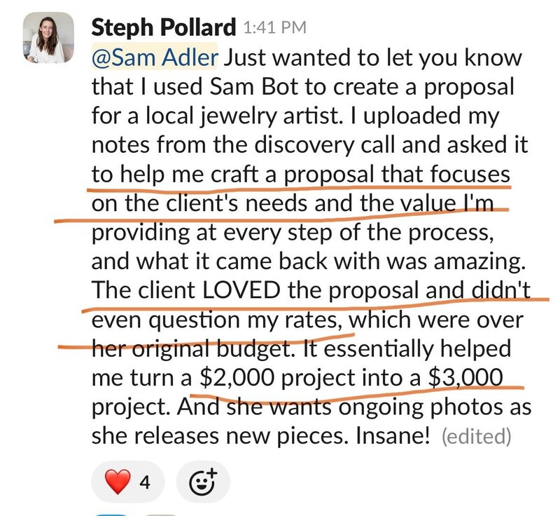 She’s trained on 8+ years of my private coaching, Profit in Style course content, and real-world strategies that have built multi–six figure photography businesses.